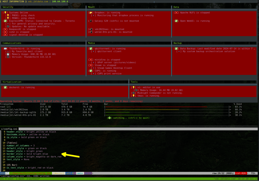 One of the biggest features introduced is the use of the logging module to implement a logging facility to log every status change event detected by the ‘hi’ tool. State is captured as a JSON file, which is then compared against the current state of each check. If there is a difference, a log is written, and the last state is updated with the current state information.